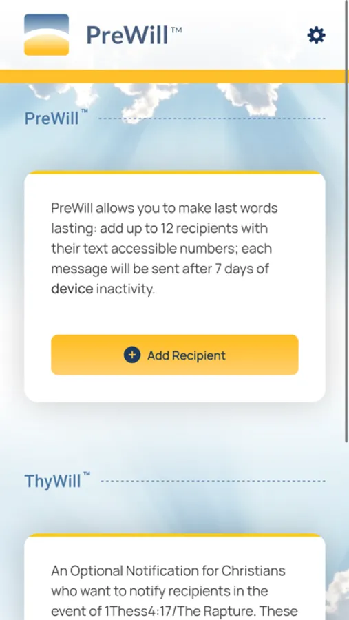 PreWill tracks user activity and allows subscribers/users to designate up to 12 family members, loved ones or friends a personalized message in the event of the users untimely passing. Personalized messages are sent based on a time period of 7 days of inactivity on all registered devices. Users can choose to pause alerts as desired when devices are inactive for extended periods of time. PreWill also includes an additional free option called ThyWill which will send up to 12 additional personalized messages in the event of a Rapture event.