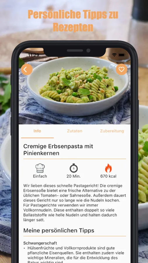 Dazu kommt eine stetig wachsende Rezeptsammlung, die sich deinen Bedürfnissen anpasst und besondere Umstände (Schwangerschaftsdiabetes, erhöhte Blutfette), Mangelzustände (z.B. Eisenmangel) und Unverträglichkeiten (Laktose, Gluten) berücksichtigt. So begleitet dich Mimba während der gesamten Schwangerschaft, um das Beste aus deiner Gesundheit und der Entwicklung deines Kindes herauszuholen.