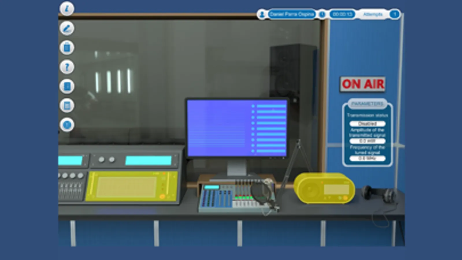 The simulator recreates a radio station with a broadcast antenna and a radio. In this practice you must configure the power of the transmitter signal and, from this, find the frequency to which the radios must tune to listen to the station. Concepts of amplitude, period, frequency and wavelength should be applied in this laboratory.