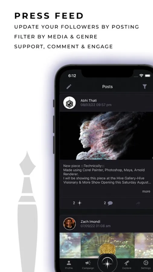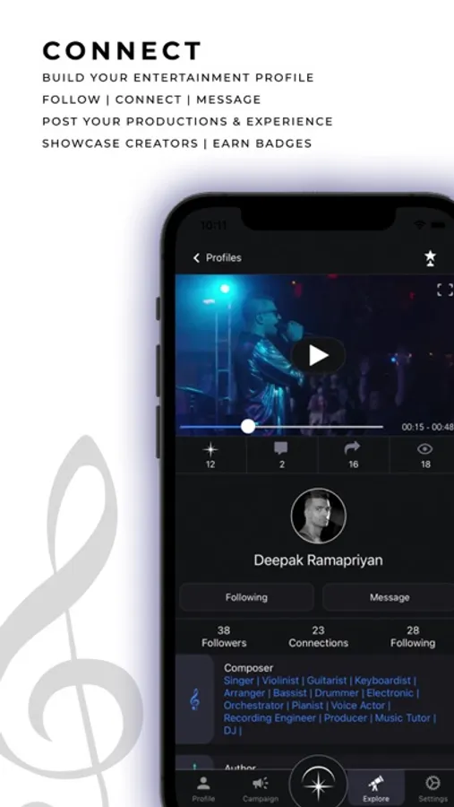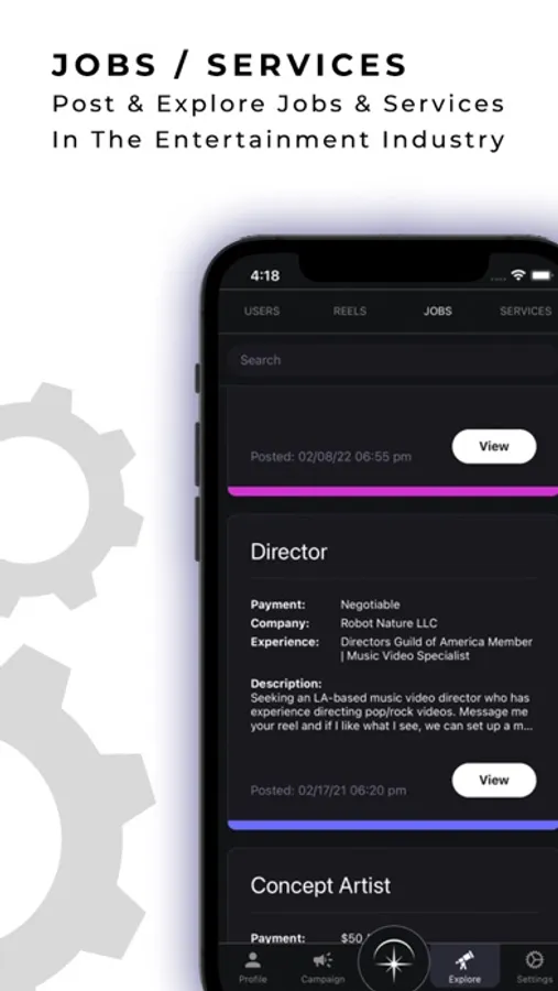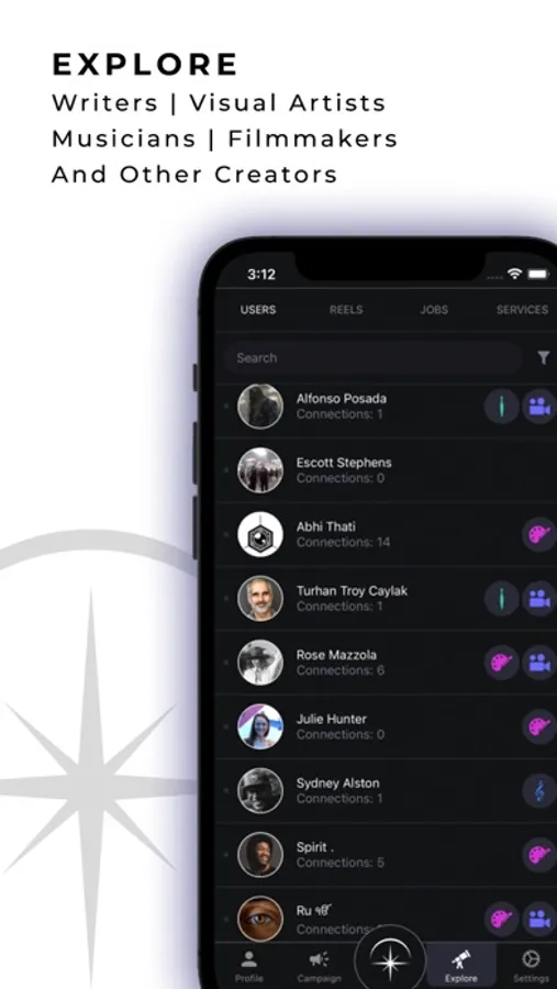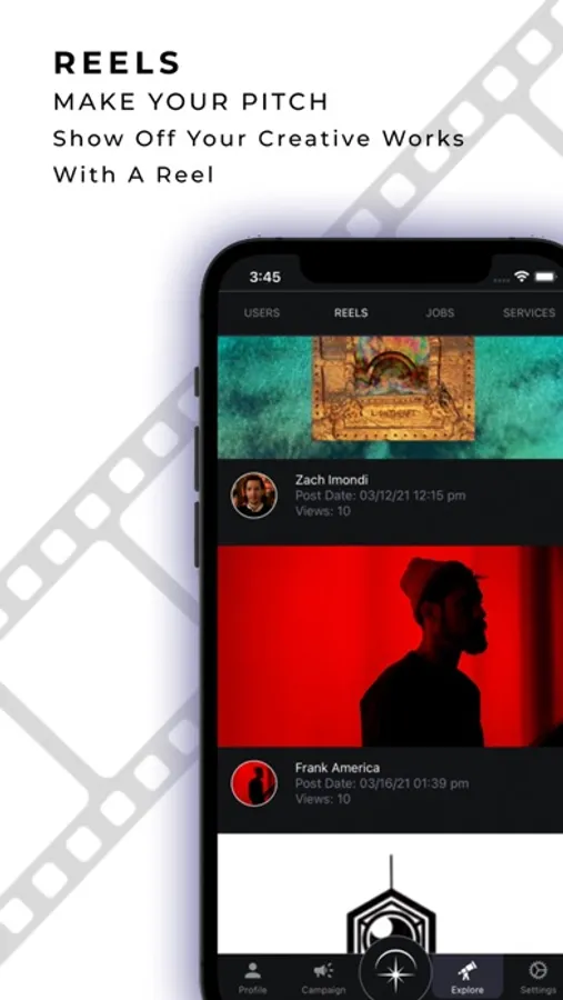Users can create profiles, interact with reels, follow/connect with other users, message other users, make posts on a customizable press feed, post/search job & service offers in the entertainment industry, and more!