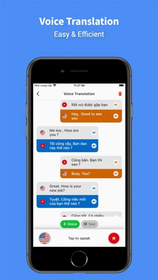 Real-time English or vietnamese text translation for phrases and words, voice to text translation