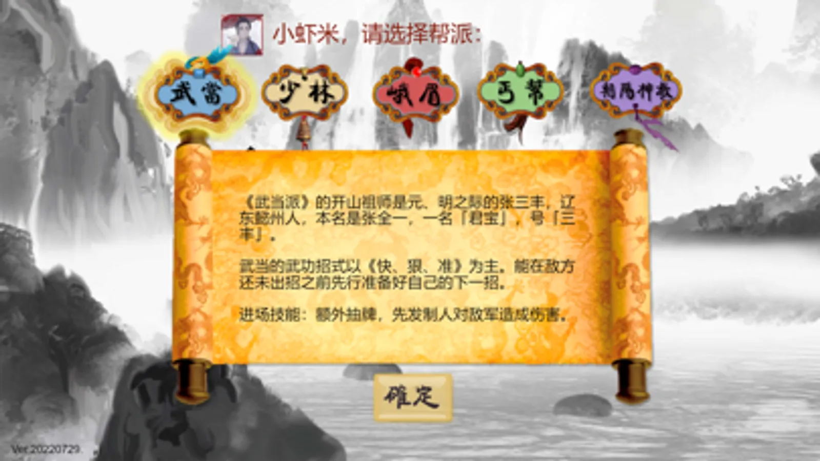当然,您并非是孤军作战、由零开始的,您可邀请以下五大门派(武当、少林、峨眉、丐帮 和 朝阳神教)为您助阵。五大门派的武功同样也各具特点,所以请谨慎选择。