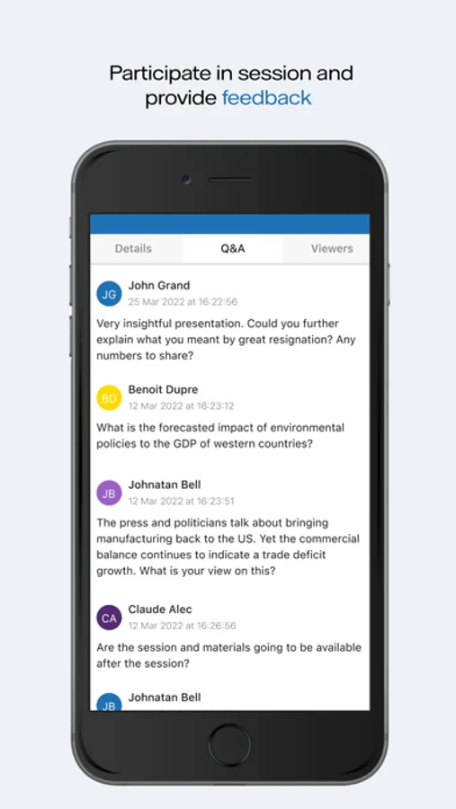 Message, exchange digital business cards, schedule meetings, complete surveys, create personal agendas, participate in live Q&A and polling sessions, study virtual libraries and meeting information, review case studies, browse speaker and attendee profiles, follow presentations, take notes, save items for after your event, and much more.