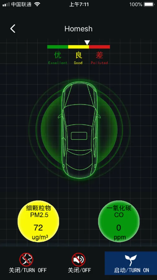 车载智能监测净化器使用软件,能实时监测车内PM2.5,一氧化碳,二样化碳等空气指数,智能报警,手机控制净化设备启停