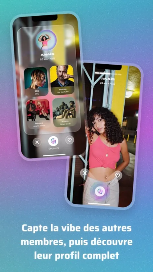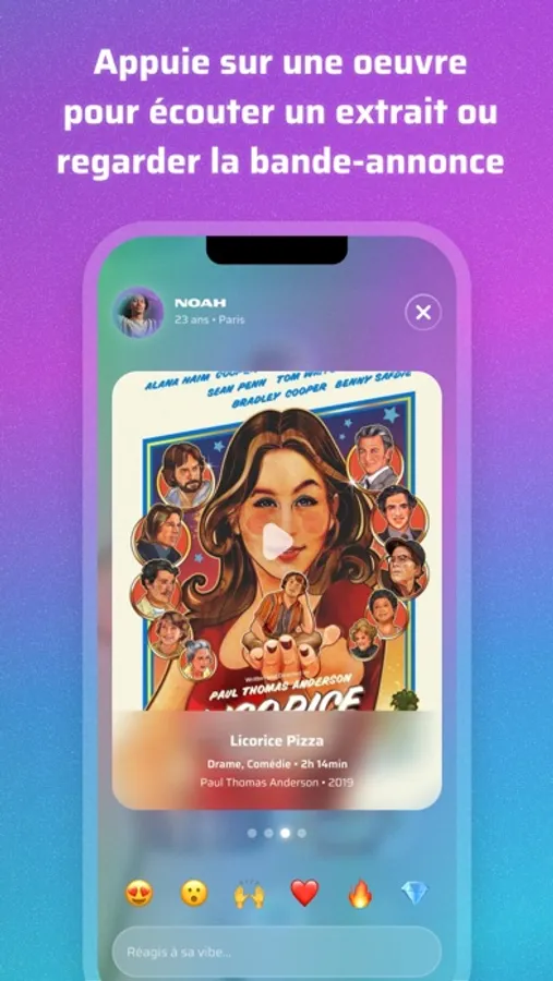Rencontre des personnes qui ont des goûts similaires aux tiens. Capte d’abord leur vibe en découvrant les sons, films, séries ou livres qu’elles ont partagées, puis utilise le long press pour faire apparaître leurs photos !