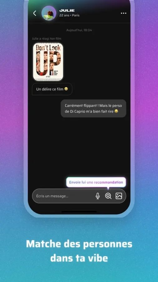 Les « salut ça va » tu trouves ça naze aussi ? Démarre une discussion intéressante en réagissant à un son ou un film que ton match a partagé, en toute détente !