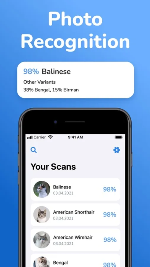 Identify any cat breed with our app! Point camera to a pet and snap. Get useful information about breeds such as health, grooming, temper, history and facts. Our app recognize up to 80 breeds. For the best performance try to get high quality and well lighten picture without items or persons in background. 85% recognition accuracy.
