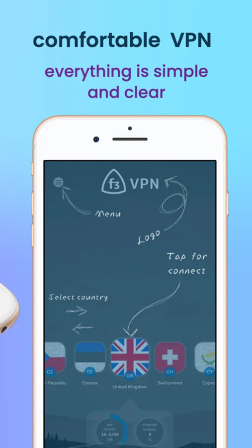 Absolutely free f3 VPN application will help you to ensure the complete protection of your personal data and make Internet surfing safe without loss of speed. All our servers are available at maximum speed and without traffic volume limit for all f3 VPN application users.