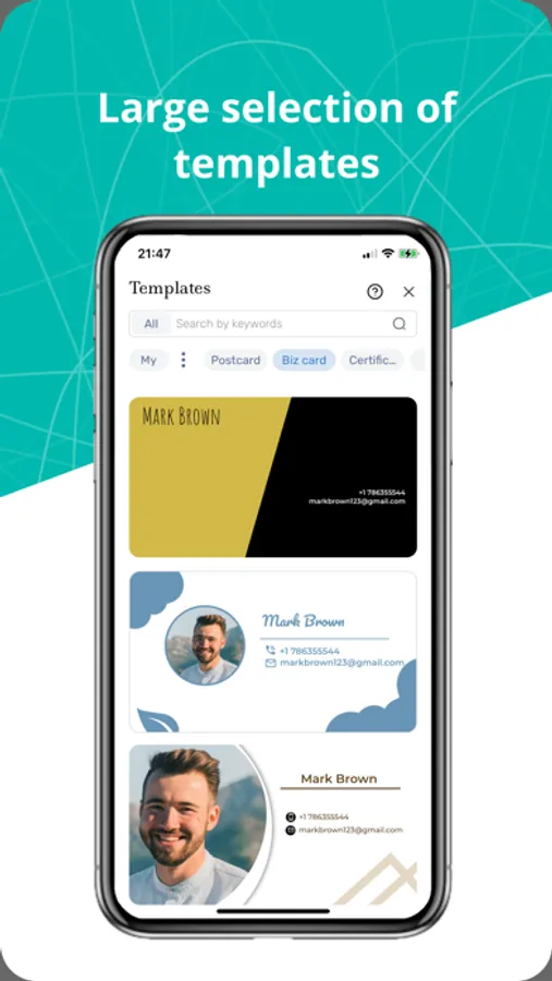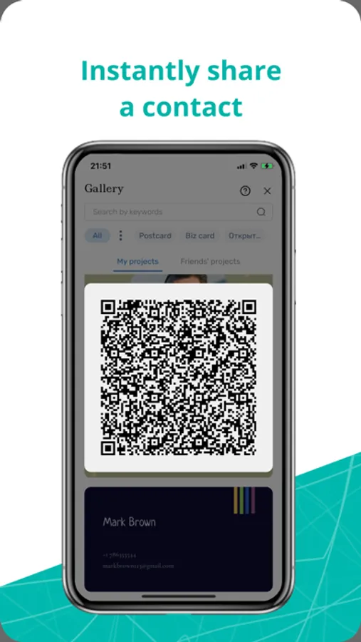 The new AI version will do everything for you if you want it to! It will create business cards, greeting cards, or invitations for anyone you tell it to. The app understands your natural speech or your text. You can modify, add, or create any element in the template. The app allows you to create any element that may be needed in your project, starting from a text with a photo inside it and ending with a QR code and video. You can also create your own personal templates and even share your projects and templates with friends in this app and view their projects too. Send your project to anyone and however you want, or print it. In this app, you can also easily share contacts from business cards through a QR code right in the app.