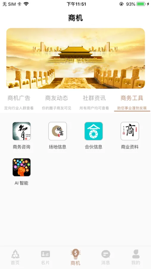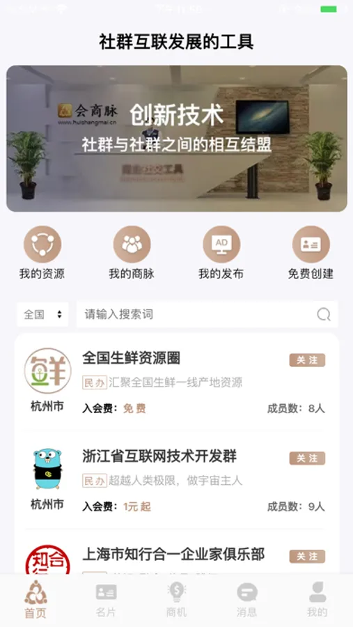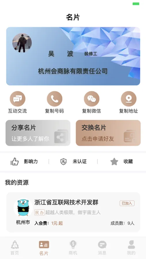 用户免费创建多功能电子名片和免费创建各类商协会、商圈组织,其中还有分享、看商机、建组织等收益。