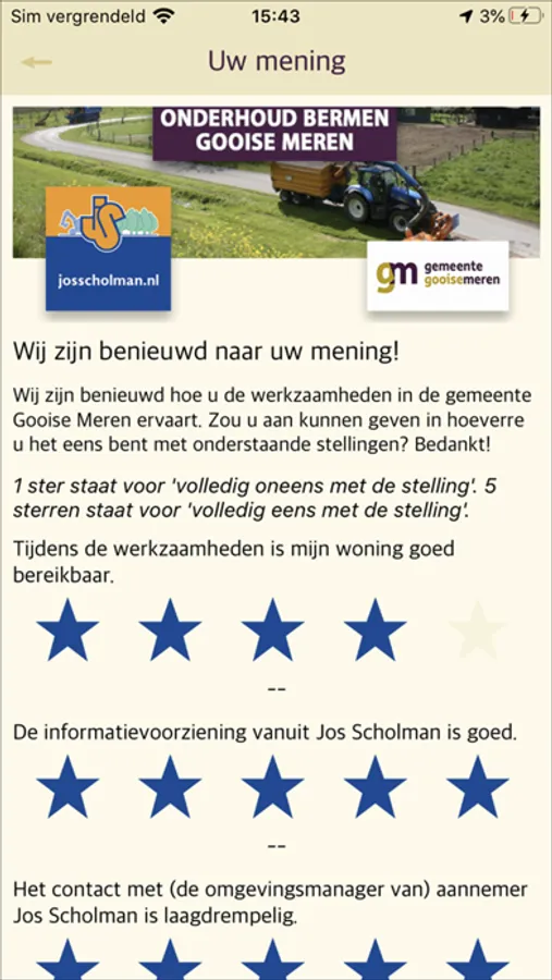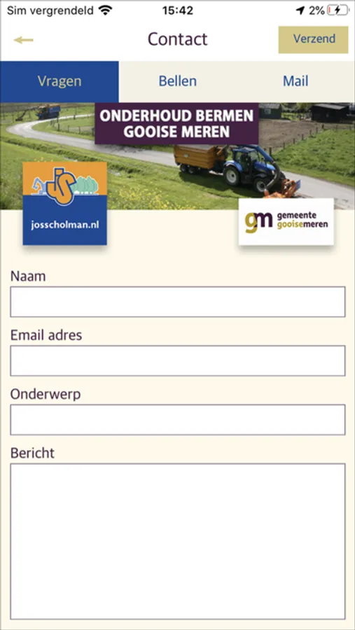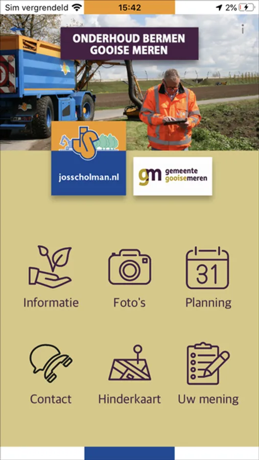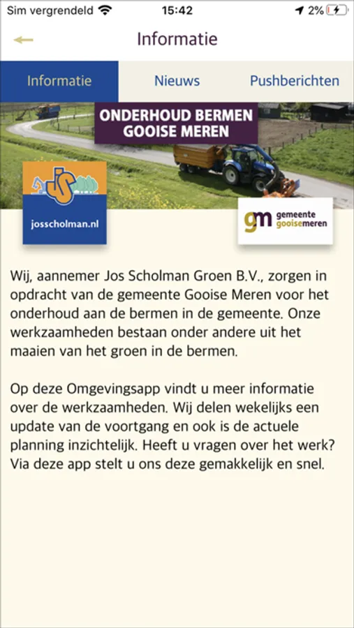 In deze app vindt u alle informatie over het onderhoud van de bermen door aannemer Jos Scholman in de gemeente Gooise Meren. Er wordt belangrijke informatie, de laatste planning en contactinformatie weergegeven. Ook kunt u op deze app vragen, opmerkingen of klachten achterlaten die betrekking hebben op het project.