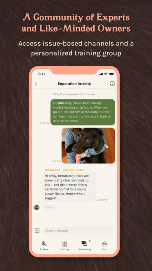 We're excited to announce the launch of Community, where you can connect with experts and other dog owners to get feedback, advice, and support. Members will also be placed in a private training group, led by their very own certified trainer.