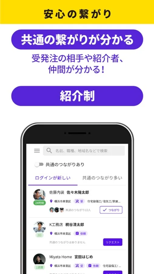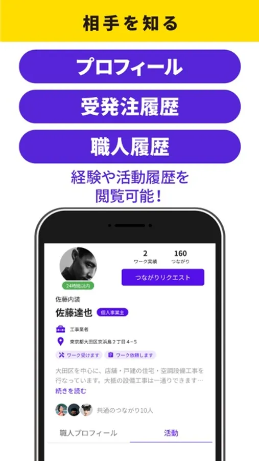 加えて、アプリ内でSNSのように他のユーザーと自由につながることができ、職人仲間や発注者とコミュニケーションを取ることができます!