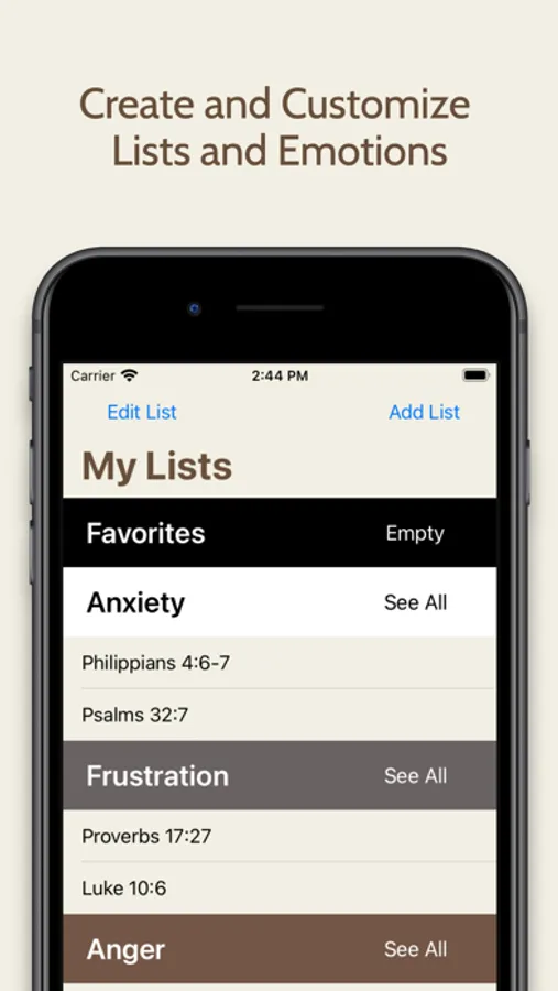 Once you load scriptures into the different emotions you might feel, all you need to do is open the app and tap that emotion and you'll see the scriptures that help you the most! Minimize the time between getting overwhelmed by emotion and being helped by God's word.