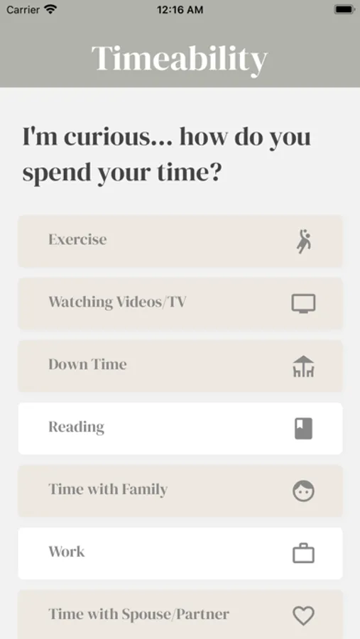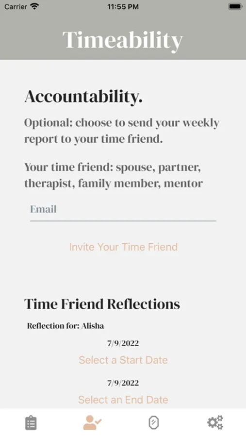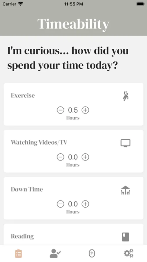 Welcome to Timeability… here to help you see how your time is spent. You’ll check-in daily, input how you spent your time, and receive a report weekly.
