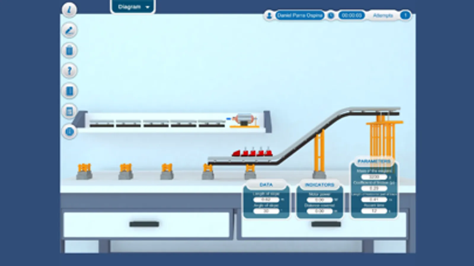 This simulator features a scale model of a roller coaster with a free fall incline and a straight section of track. According to the mass parameter given by the simulator, the engine power must be configured to raise the wagon to the top of the mountain and modify the length of the straight section so that the wagon stops due to the action of friction.