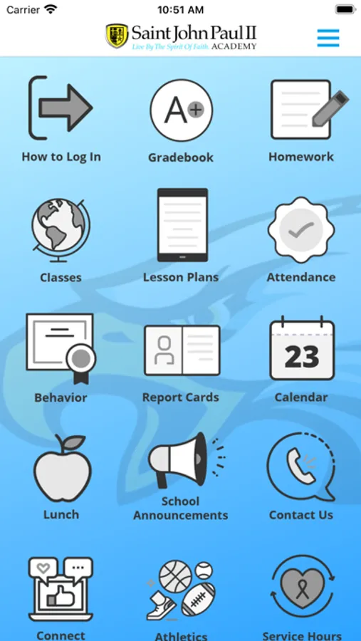Welcome to the FACTS Family Custom App for Saint John Paul II Academy in Boca Raton, FL! This app is a one-stop-shop for our school community, with anytime, anywhere access to all the tools, content, and communications parents need to stay connected and engaged. School information available in one easy to access place includes Announcements, School Calendar, Student Grades and Homework, Family Accounting, Giving Options, and much more!