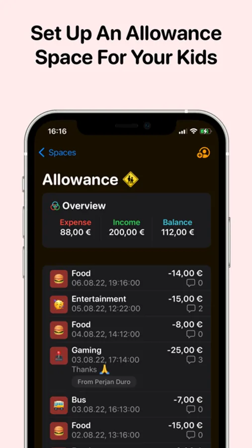 For example, you can use MoneySpaces to set up allowances for your kids, split living expenses with your roommates, manage debts with your friends, plan a trip with shared expenses, track your travel expenses on a business trip, and even calculate the cost of events and parties!