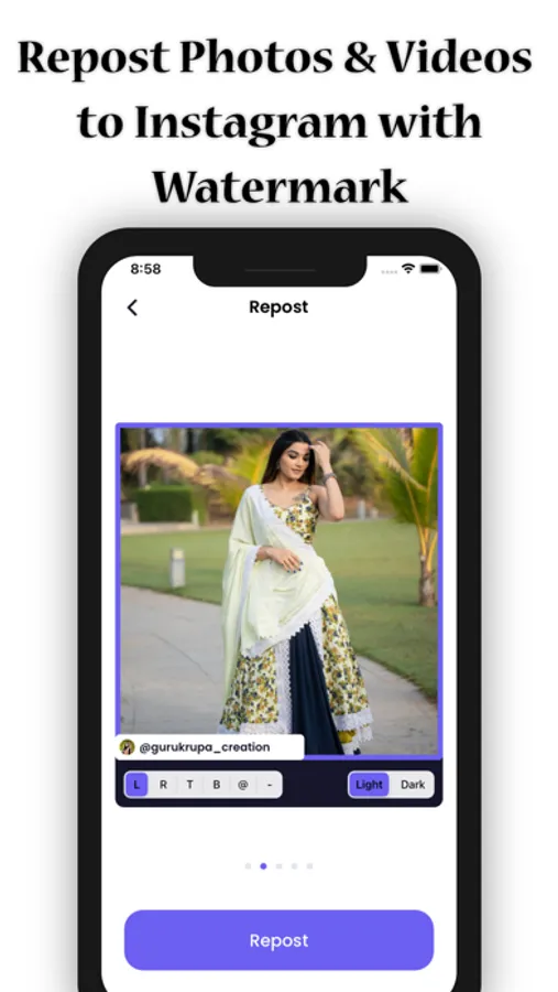 We don't use awkward dark stripes at the edges of your post like other repost ig apps - our watermark is clean and clear, so the picture remains beautiful as it is. You can use this to add copy rights to your photos.