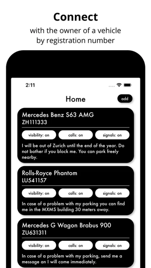 You can register your vehicle(s) and make them available for others to search for and in case of a need to contact you. You can let people to call you, send you notifications or you can leave a message for others when they search for your car registration number and provide them with some valuable information.