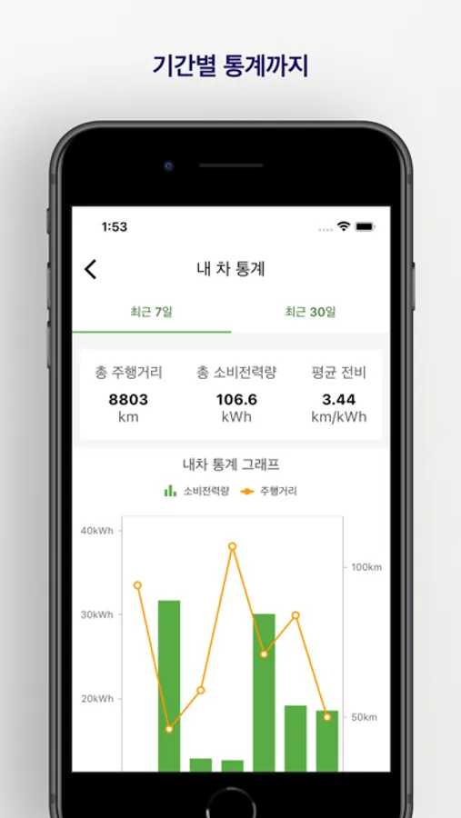 - 내 차량 주행거리, 총 소비전력량, 평균 전비를 일별 주별 월별로 나눠 그래프로 확인 가능 합니다.