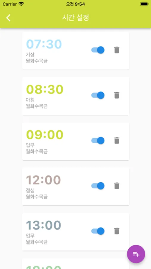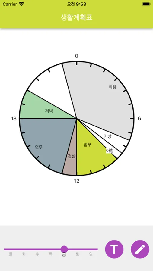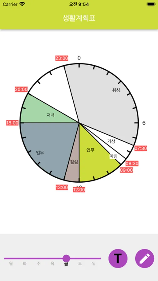 월요일부터 일요일까지 24시간을 기준으로 생활계획표를 짤 수 있습니다. 정해진 시간에 알림도 뜹니다. 등록된 일정은 잠시 꺼 놓을 수도 있고 수정도 가능합니다. 화면을 확대하거나 축소도 가능합니다.