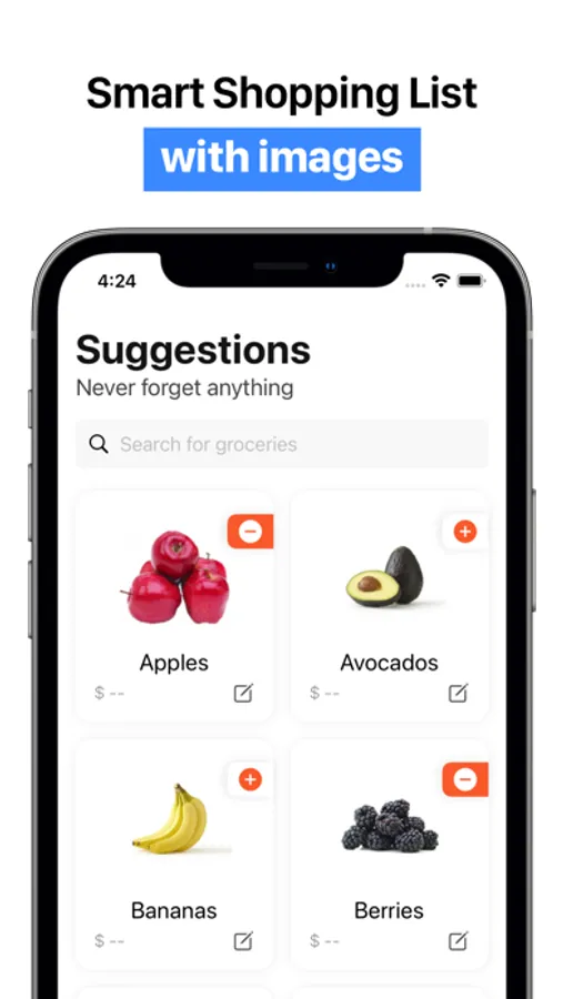The app features a list of grocery items with beautiful images, giving you the ability to quickly select items to add to your list.