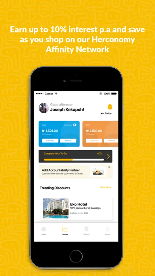 Herconomy savings is a digital solution that offers women access to financial services which include savings and discounts. With our Herconomy savings, women can save and earn high interest while enjoying access to discounts from partners within our affinity network.