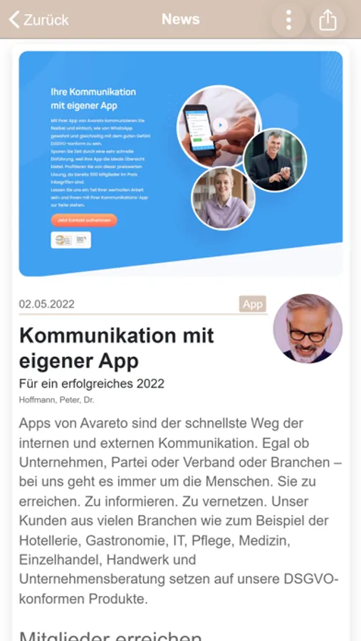 Organisieren Sie Ihr Vereinsleben vollumfänglich digital: Kommunikation von Neuigkeiten und Mitgliederzeitschriften, Verwaltung aller Mitgliederdaten, Erstellung von Projektgruppen, Organisation von Veranstaltungen mit Zu- und Absagen, Einzel-, Gruppen und Organisations-Chat, Bereitstellung von Dokumenten, öffentliche Fotopinwand und vieles mehr...