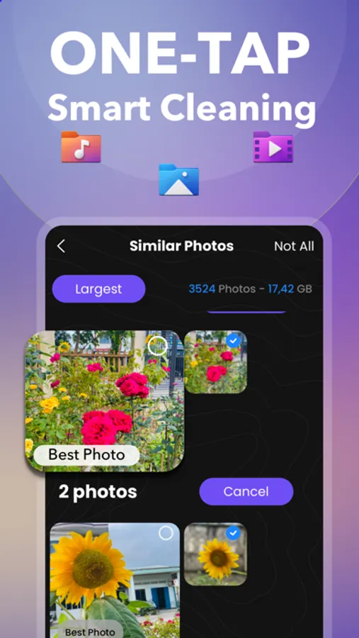 Quickly clean up your iPhone in 1 click. Our app automatically searches for similar photos, screenshots, videos and contacts, you can decide to delete them on you own.