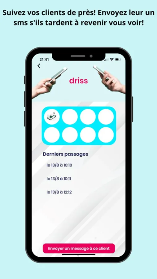 Gagnez du temps et enregistrez tous vos clients. Scannez son QR code, une carte virtuelle est crée. Suivez sa régularité de passage dans votre commerce avec la date et l'heure du dernier scan. Envoyez des messages promotionnels à tous vos clients en un seul clic et attirez un max de personnes ! Méthode de prospection très facile et ludique.