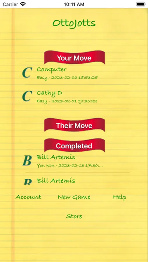 OttoJotts is the secret word game you can play against your friends. You each pick a 5-letter word and use guesses to figure out what your opponent's word is before they deduce yours. You can play against your friends or against random opponents who are your skill level. And you can play solitaire games against the computer with different difficulties - from Easy through Master!