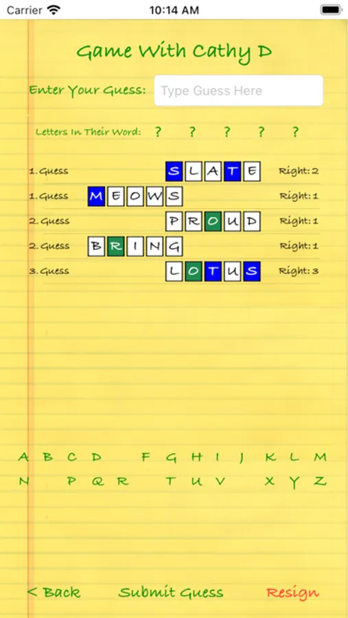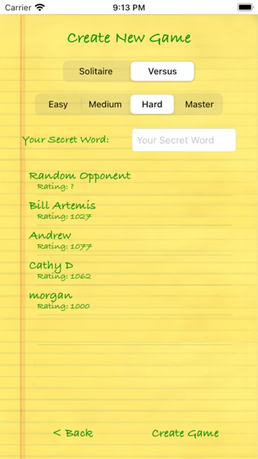 Easy mode lets you know what letters are in your opponent's word and even whether they're in the right place. Medium difficulty will let you know which letters are in your opponent's word but not if they're in the correct position. Hard will let you how many letters in your guess are in your opponent's word. And Master (informally called "Nightmare") only lets you know how many letters are in the correct place. A true challenge, even for word masters!