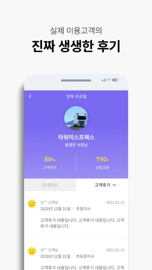 - 실제이용고객이 올린 찐후기를 통해 우리동네 잘하는 이사업체를 쉽게 찾을 수 있어요