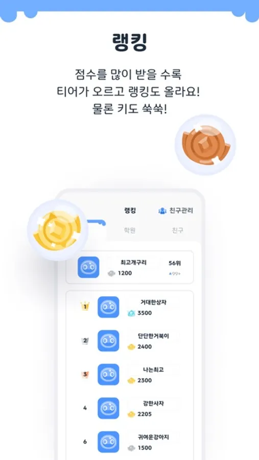 점수를 많이 받을 수록 티어가 오르고 랭킹도 올라요! 물론 키도 쑥쑥!