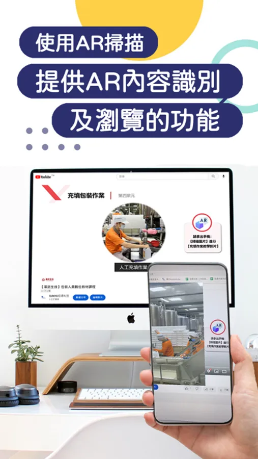 開啟數位教材課程影片,並使用此APP對準畫面中的照片,即可馬上觀看AR(增強現實技術)的效果,透過影片輕鬆學習!