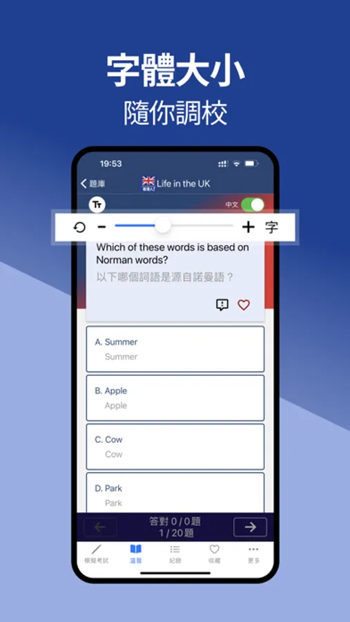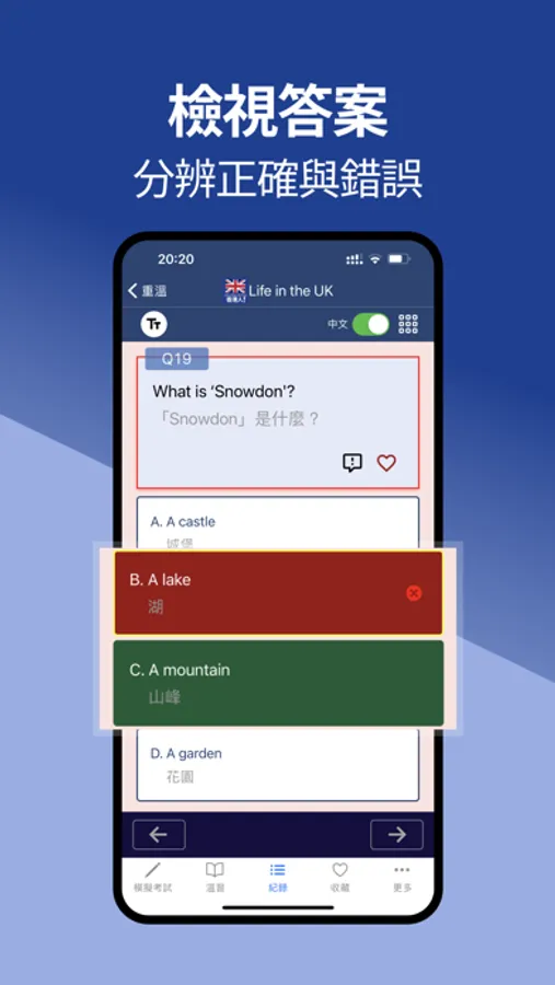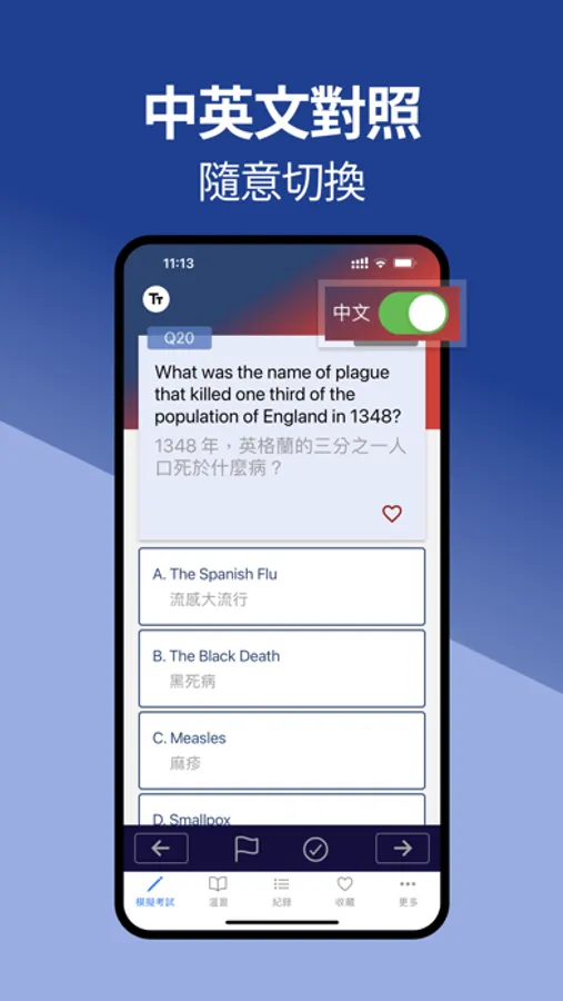 每條題目均附有中文翻譯,使用戶更容易理解內容。只需一按,用戶可以隨時切換〈全英文〉或〈中英文對照〉,以進行練習或模擬考試。