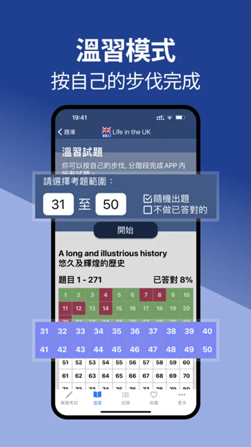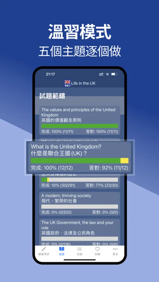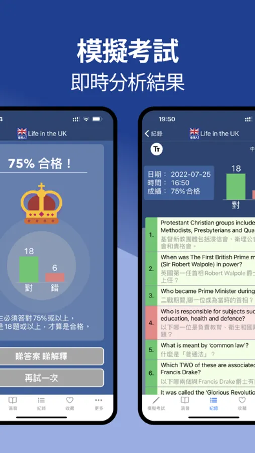 《Life in the UK》試題內容主要涵蓋英國的歷史和文化,包括許多戰役、事件、人物、法案等。雖然實際考試只有24題,但由於其範圍十分廣泛,有許多專有名詞和用語,要記的內容很多,而且是全英文,建議大家事前要花多點時間來預備這考試。使用【香港人!Life in the UK Test for HK】中英對照的方式來溫習及做試題,可以更容易理解內容,有助記憶,十分適合香港人使用!