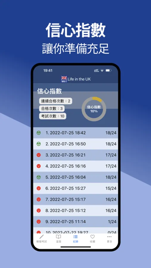 完成模擬考試後即時顯示結果,用戶可以知道哪些題目做錯,哪個是正確答案,好能分辨重點。每個模擬考試都會按日期時間記錄下來,用戶可隨時查看成績及翻查題目,幫助學習。
