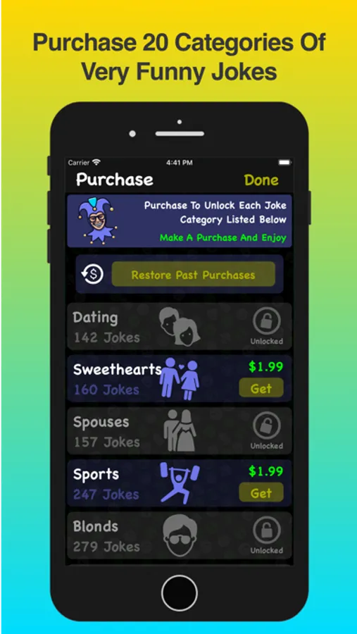 Access to 3100+ Premium Content jokes is also available via In-App purchases. Just a onetime purchase price per joke category and that's it.