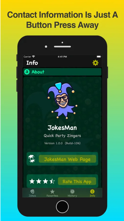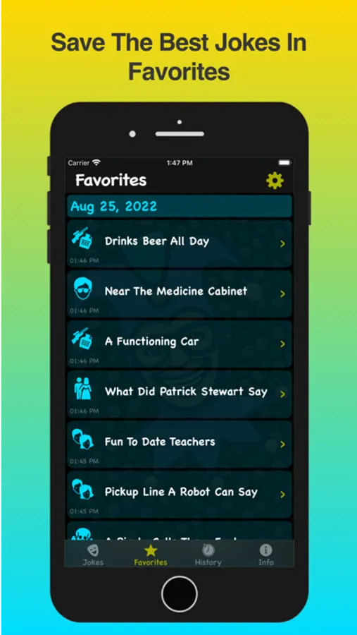 ○ Save each viewed joke as a Favorite which is stored on your device for later viewing.