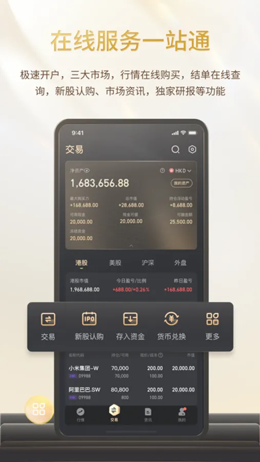 极速开户,三大市场,行情在线购买,结单在线查询,新股认购、市场资讯,独家研报等功能