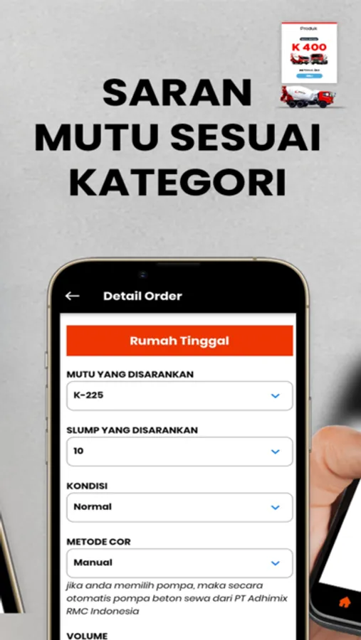 Pilihan Kategori Beton untuk Rumah tinggal, Gedung/ Kantor, Jalan perumahan, Jalan Utama, Pabrik, Kolam renang dan lain-lain menjadi kelengkapan dengan saran mutu yang kami berikan. Dan kami menyediakan beton khusus Adhimix Fast Track yang bisa digunakan dalam waktu 24 jam dan juga beton berpori yang ramah lingkungan.
