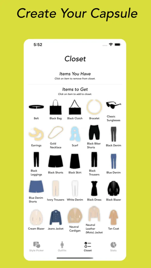 Navigate to the Closet tab and effortlessly manage your wardrobe inventory. Simply mark the items you already own from the comprehensive list of 45 capsule wardrobe essentials. Keep track of what's left, making your next shopping trip a breeze. Personalize your wardrobe by seamlessly adding your own pictures and items to the app, tailoring it to your unique style.