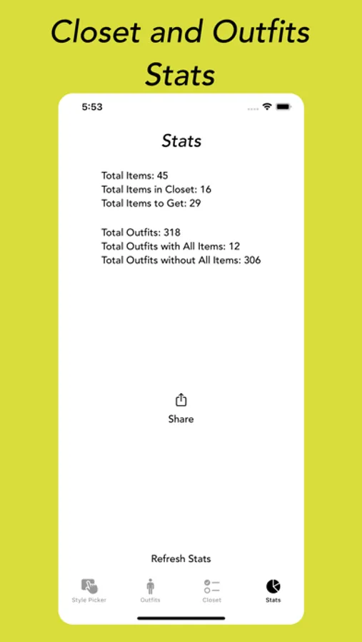 For the fashion-savvy individuals interested in their fashion statistics, the Stats tab provides valuable insights. Discover how many outfits you can create using the items in your closet. Be amazed by the incredible versatility and endless possibilities at your fingertips.
