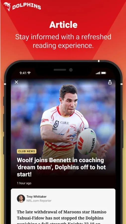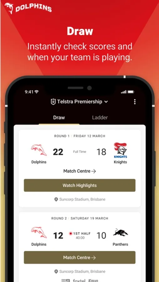 Welcome to the brand new Official Dolphins app. Our completely streamlined experience gives you access to your favourite team and favourite players - plus you'll get breaking Dolphins news, live scores, stats, game day information and match highlights. It's everything you need to know about the Dolphins, no matter where you are.