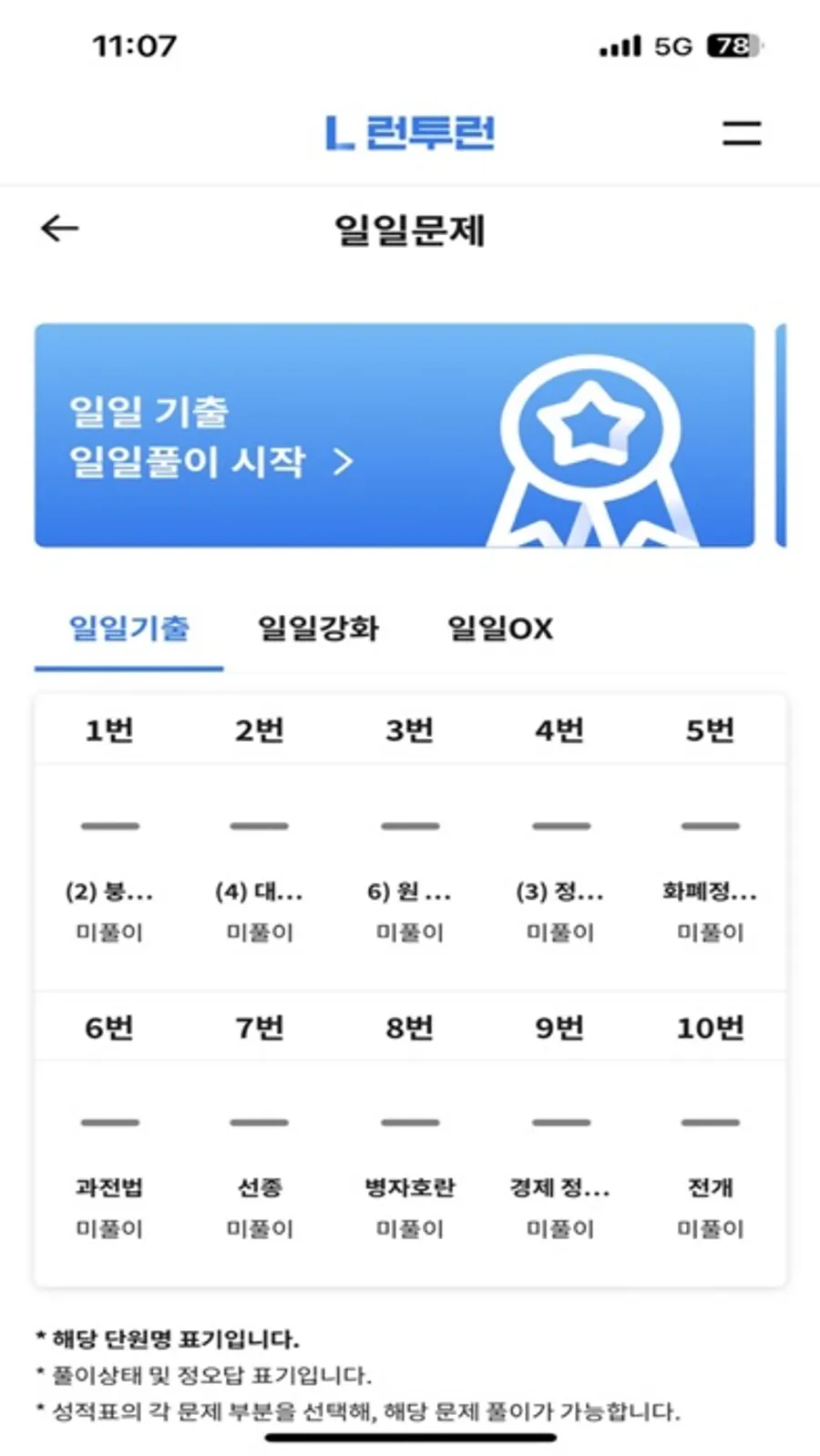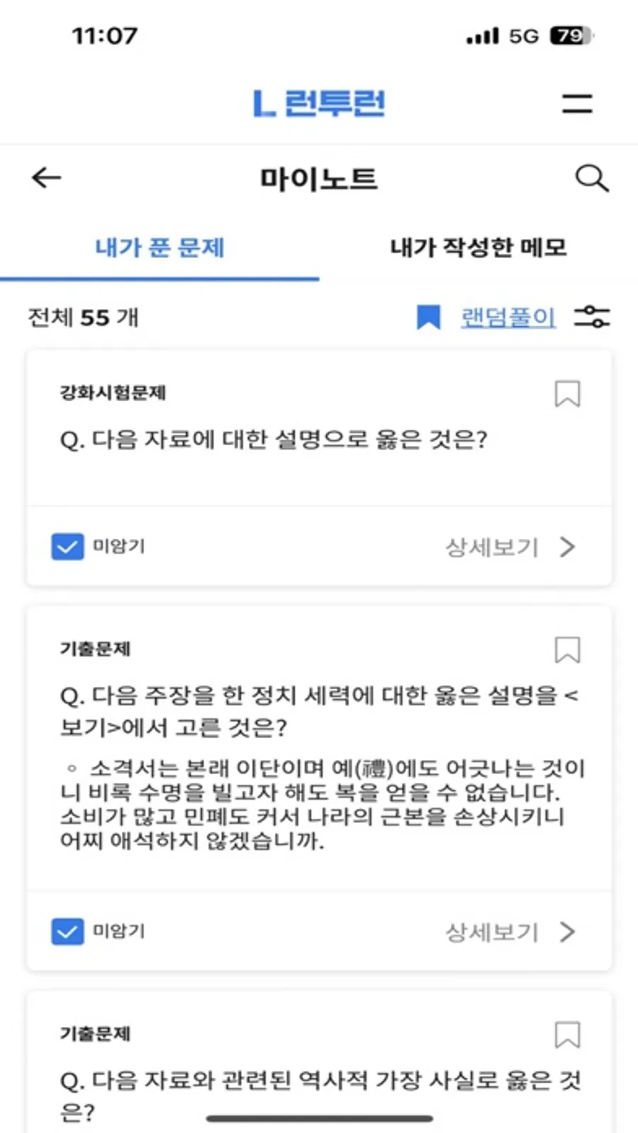 런투런 학습앱은 ‘꼼꼼합니다’ 공시생들이 반드시 풀어야 할 기출문제부터 OX문제, 스마트노트(개념) 까지 모두 들어있습니다. 문풀과 개념 학습을 반복하다보면 어느 순간 목표 점수에 도달해 있는 자신을 발견할 수 있습니다.