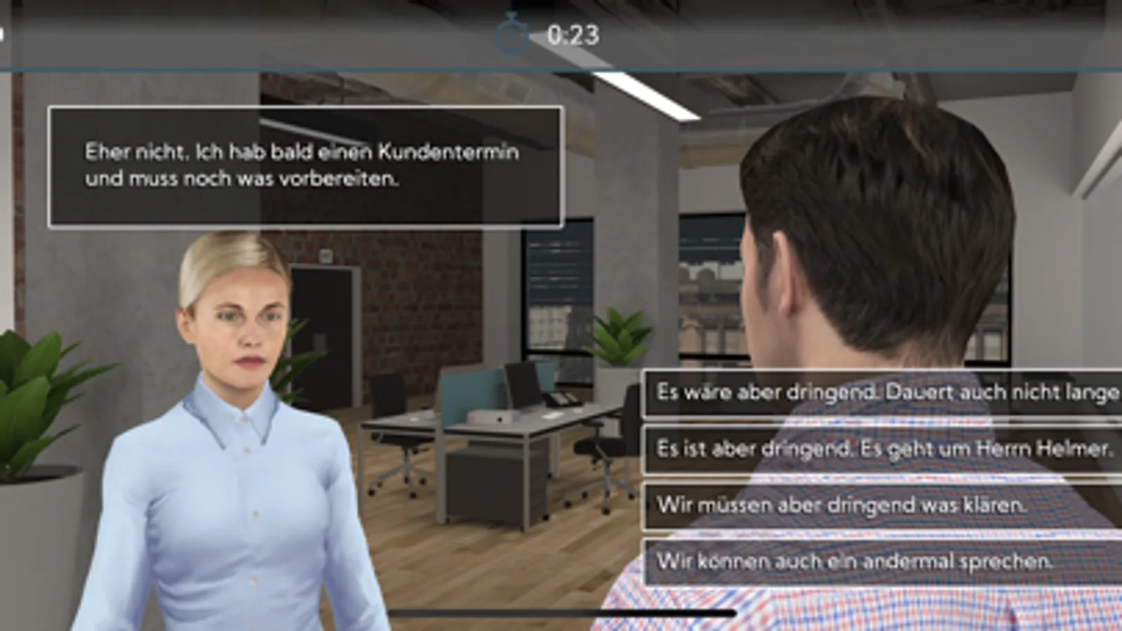 In der digitalen Arbeitswelt wird viel über die Bedeutung von Soft Skills gesprochen. Aber was sind sie? Soft Skills sind persönliche Fähigkeiten, die Ihnen helfen, effektiv mit anderen Menschen zusammenzuarbeiten. Der xR Trainer ist eine revolutionäre virtuelle App für das Training von Soft Skills in einer einzigartigen Erlebniswelt. Mit dieser App können Benutzer:innen wichtige Fähigkeiten für den Arbeitsplatz erlernen und entwickeln. Ganz gleich, ob Sie Ihre Kommunikationsfähigkeiten, Ihre Teamfähigkeit oder Ihr Führungspotenzial verbessern möchten, der xR Trainer bietet Ihnen eine sichere und stressfreie Umgebung. Erleben Sie die Faszination der virtuellen Realität noch heute mit dem xR Trainer!