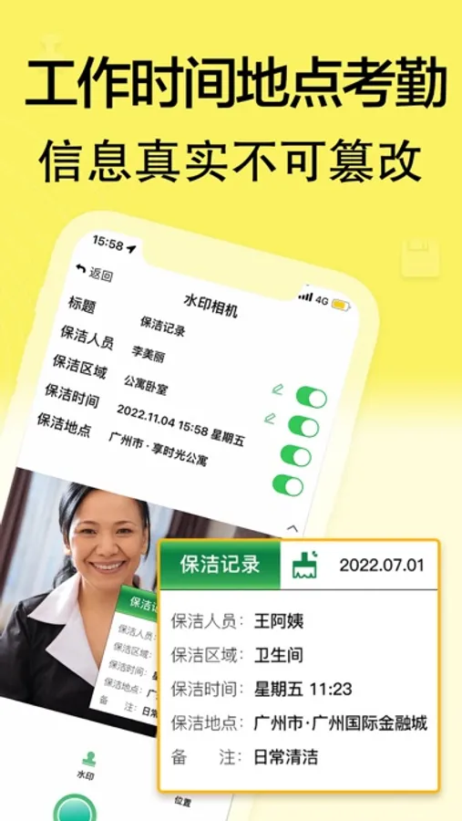 时间取自远程服务器时间,跟手机设置时间无关,时间准确真实防篡改