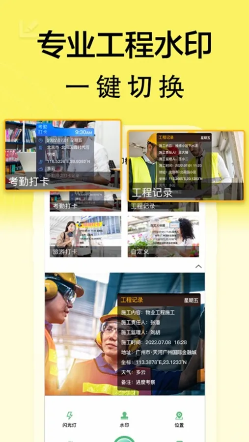 提供了丰富的水印模板供您选择,考勤打卡水印、工程记录水印、旅游打卡水印、自定义水印、保洁记录水印、执勤巡逻水印、会议记录水印、值班打卡水印。我们提供了各行各业都可以使用的工作拍照,工作内容证明水印模板